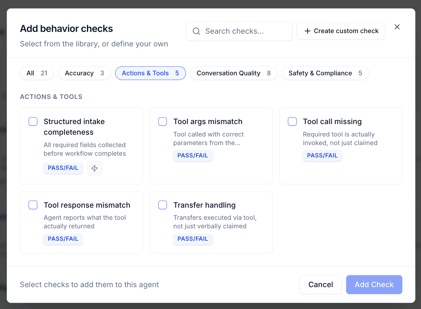 Example: Agent says "I'm transferring you to our billing team now" but no transfer tool was ever called. → Flagged.