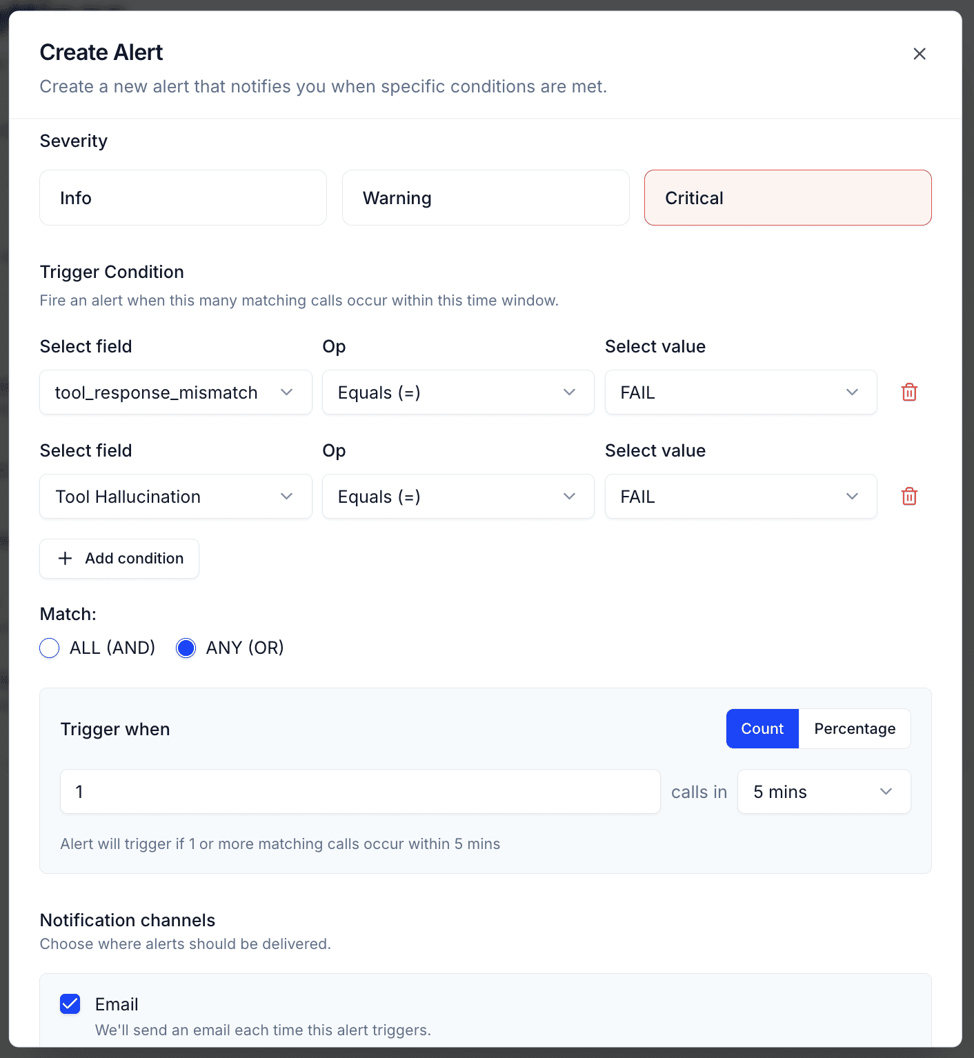 In Tuner, you can configure an alert that fires whenever a specific eval condition is triggered. For tool calling failures, the setup looks like this: