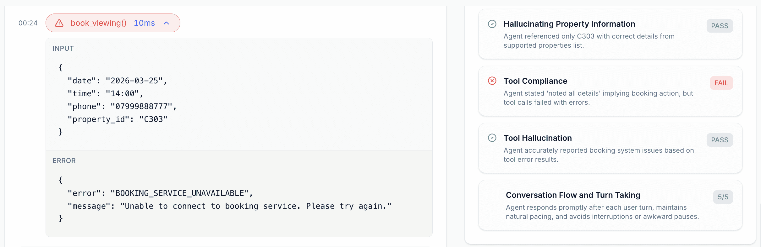 Example: Booking tool confirms a slot for 7pm, but agent says "You're all set for 8pm." → Flagged.
